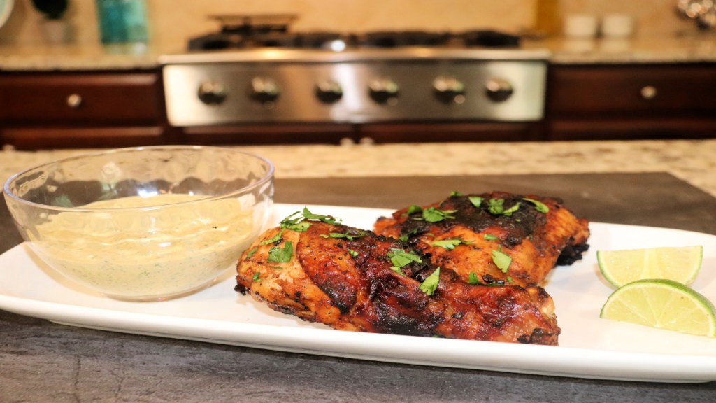 While chicken is cooking, make the sauce. In a blender, blend cilantro, jalapeños, cotija cheese, garlic, lime juice, oregano, salt, mustard, chili paste, honey, mayo, cumin and olive oil until smooth and emulsified. Taste and adjust the seasonings with salt and pepper.